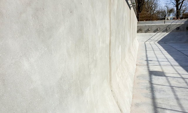 Dieses Becken wurde beim Baubeginn im Januar nach den Betonabtragsarbeiten komplett eingepackt, sodass Temperaturen, Luftfeuchte und Taupunkt für die folgenden Beschichtungsarbeiten permanent eingehalten werden konnten. Weiterhin wurden aufgrund der Starken Rissbildung in den Betonflächen neue Fugen angelegt. Da die einzelnen Bauteile nun genügend Platz für Bewegungen haben, kann sichergestellt werden, dass es nach der Instandsetzungsmaßnahme nicht erneut zu einer starken Rissbildung kommt.