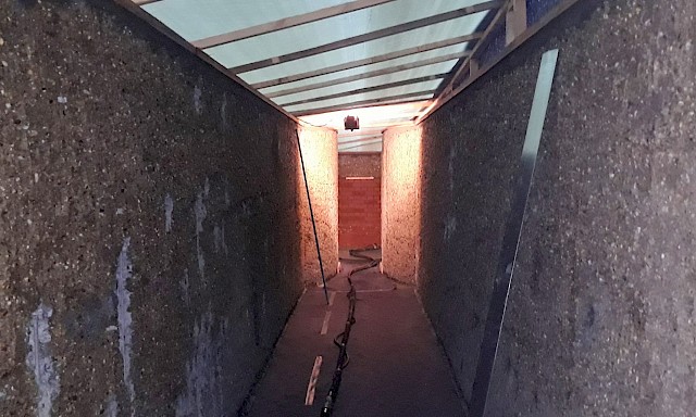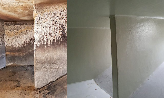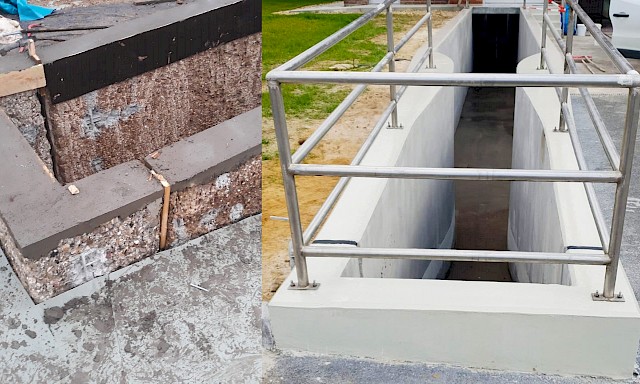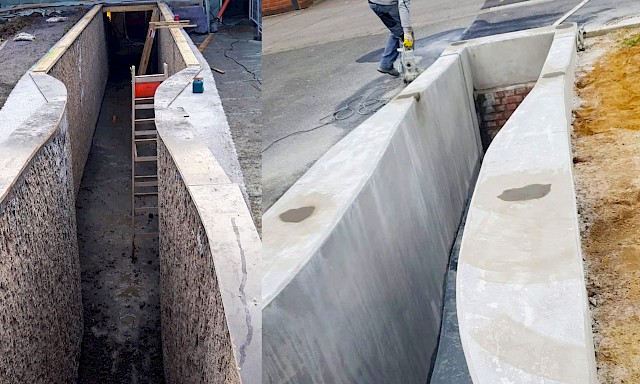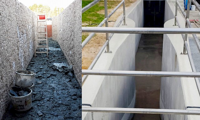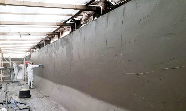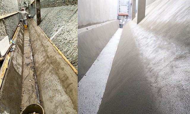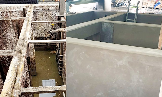 Über die gesamten Flächen von ca. 700 m² (teils schwer zugängliche Flächen) wurde der sehr stark geschädigte Beton, in Tiefen von ca. 5 cm abgetragen. Partielle Schadstellen wurden ordnungsgemäß bearbeitet. Anschließend wurden Wand und Deckenflächen mit einem hochsulfatbeständigen SPCC in einer Stärke von 5 cm versehen. Auf die Bodenflächen wurde der ebenfalls hochsulfatbeständige PCC in Handarbeit auf einer Haftbrücke eingebracht. Die Flächen wurden danach mit einer Feinspachtel überzogen. Final wurden alle Flächen mit einem mehrschichtigen Epoxidharzsystem beschichtet. Dieses System stellt den dauerhaften Schutz der Betonflächen sicher.