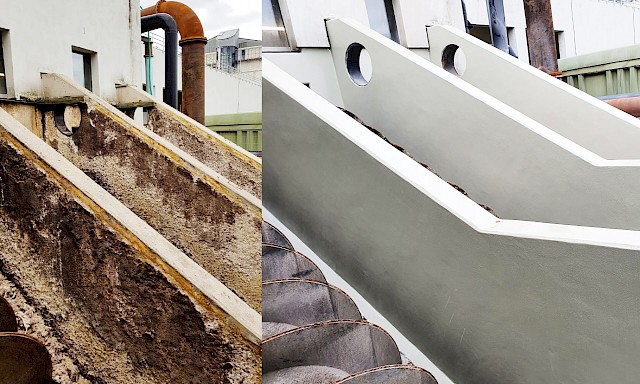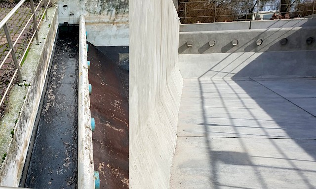 Auf der Kläranlage Stolberg setzten wir den Zulaufkanal instand, der durch den Rechen sowie die Venturi-Einschnürung führt. Vom Planungsbüro wurde eine konventionelle Betoninstandsetzung mit mineralischen PCC Mörteln vorgegeben. Es musste darauf geachtet werden, dass die Venturi-Rinne Ihre genauen Abmessungen nach der Instandsetzung behält. Nach aufwändigen Vermessungsarbeiten wurden Schablonen angefertigt, die nach dem Betonabtrag zum Einsatz kamen. Die Geometrie wurde dann mit Instandsetzungsmörtel wiederhergestellt.