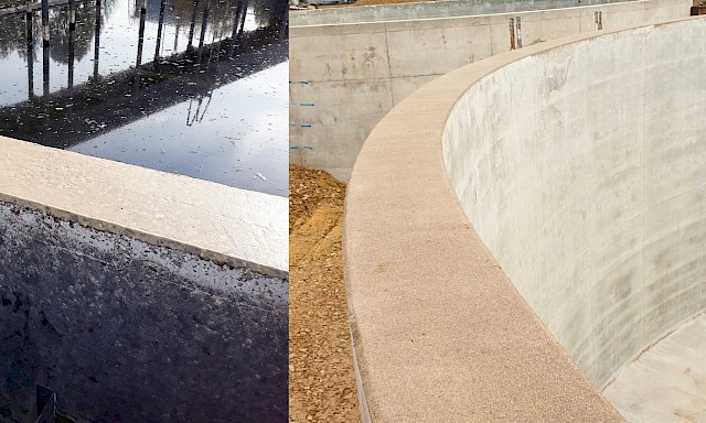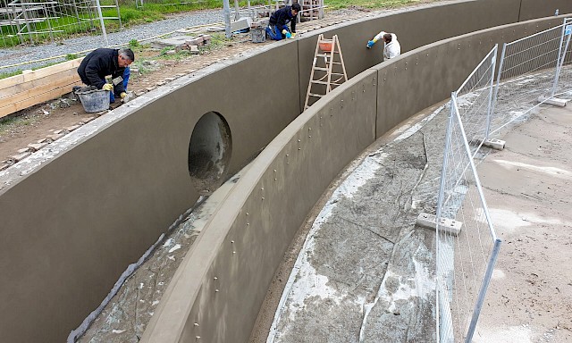 Es handelt sich um ein großes Rundbecken. Die Kunst besteht dabei darin, Kantenschalungen zu erstellen, die die Rundungen des Bestandes wiederherstellen. Dies ist uns sowohl in dem Hauptbecken als auch in dem Überlaufgerinne sehr gut gelungen.