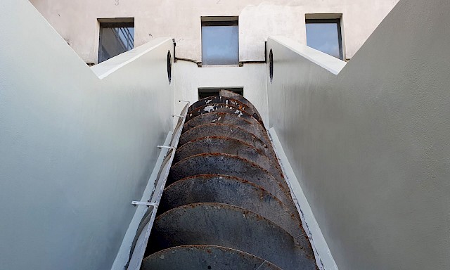 In allen Bereichen wurden sämtliche Wand Boden und Deckenflächen saniert. Nachdem das Zulaufpumpwerk zum ersten Mal geöffnet wurde, stellte sich ein extrem hoher Angriff durch biogene Schwefelsäure heraus. Es wurde beschlossen, in dem besagten Zeitraum nicht nur eine konventionelle Instandsetzung mit mineralischen Produkten durchzuführen, sondern final alle Flächen mit einer chemisch hoch belastbaren XBSK Beschichtung zu versehen. Zuerst wurde die Abwasserförderschnecken mit einer Eigenkonstruktion begehbar gemacht und ein Treppenturm in das Zulaufpumpwerk gestellt. Anschließend wurden die nachfolgenden Kanäle mit 900 mm Kernbohrungen geöffnet, sodass der Zutritt in diese gewährleistet werden konnte.