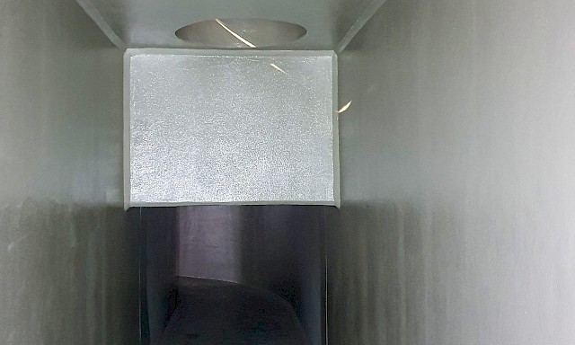 Der geschlossene Behälter ist ausschließlich durch ein kleines Mannloch am unteren Fuß, sowie einen Deckel am oberen Ende des Behälters zu erreichen. Das gesamte Bauwerk stellte sehr hohe Anforderungen an uns. Das 900 m³ Raumgerüst konnte nur durch die Mannöffnung montiert und demontiert werden. Das Bauwerk musste permanent mit Frischluft versorgt werden. Ebenfalls mussten Temperaturen, Luftfeuchte und Taupunkt permanent geregelt werden.