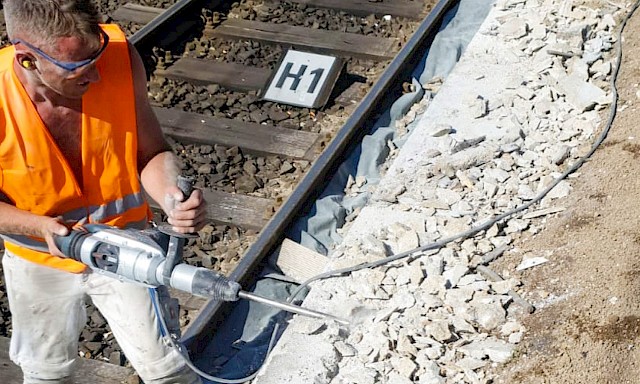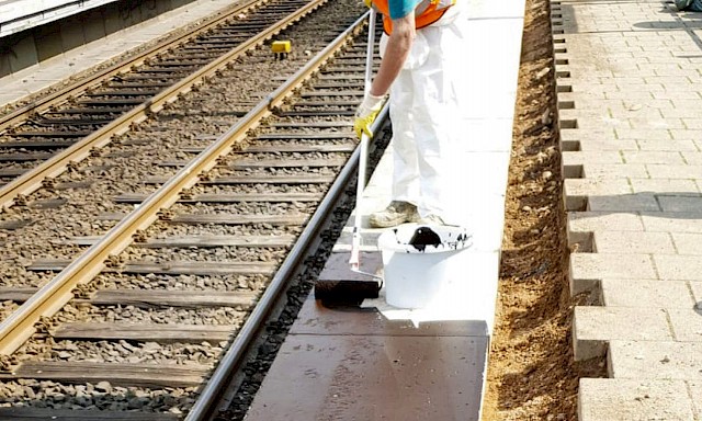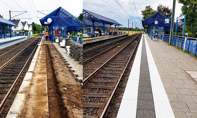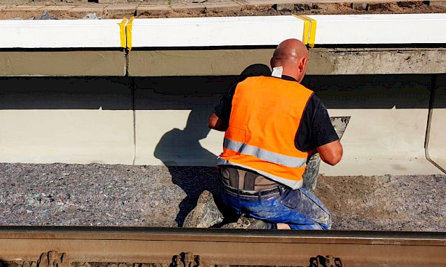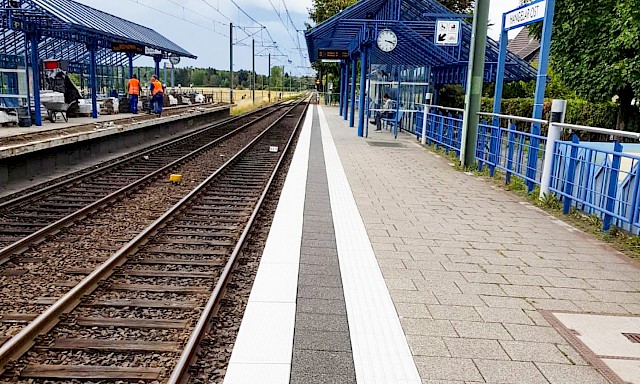 Es ist bereits der zweite Bahnsteig, der durch uns saniert wurde. Die zwei 60 Meter langen Abschnitte wurden innerhalb von vier Wochen saniert. Die besonderen Anforderungen liegen ganz klar im Bereich Arbeitssicherheit. Arbeiten an einer Bahnlinie sind immer sehr speziell. Die Gleise konnten nicht außer Betrieb genommen werden. Deshalb werden die Instandsetzungsarbeiten immer unter den Augen eines Sicherheitsbeauftragten ausgeführt. Die fahrenden Züge werden durch ihn angekündigt und die Mitarbeiter müssen das Gleis räumen. Es entsteht Mehraufwand durch Ausfallzeiten und kompliziertere Arbeitsorganisation.