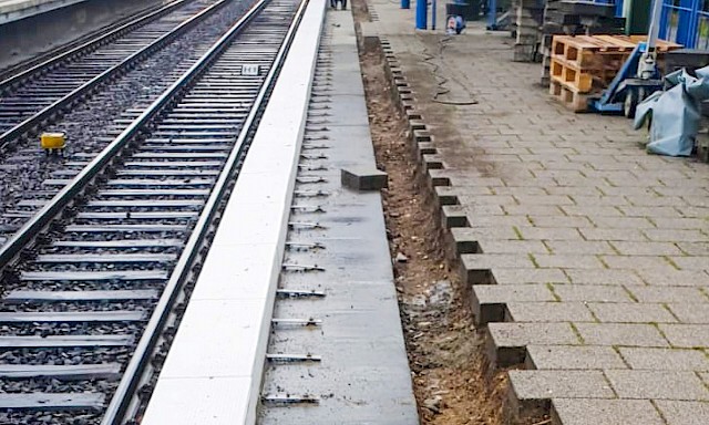 Die Sanierungsarbeiten bestanden aus der Instandsetzung und Abdichtung der Bahnsteig C-Steine sowie dem Verlegen neuer Kantensteine, Plattenbelag, Schachtdeckel und Fugenausbildung.